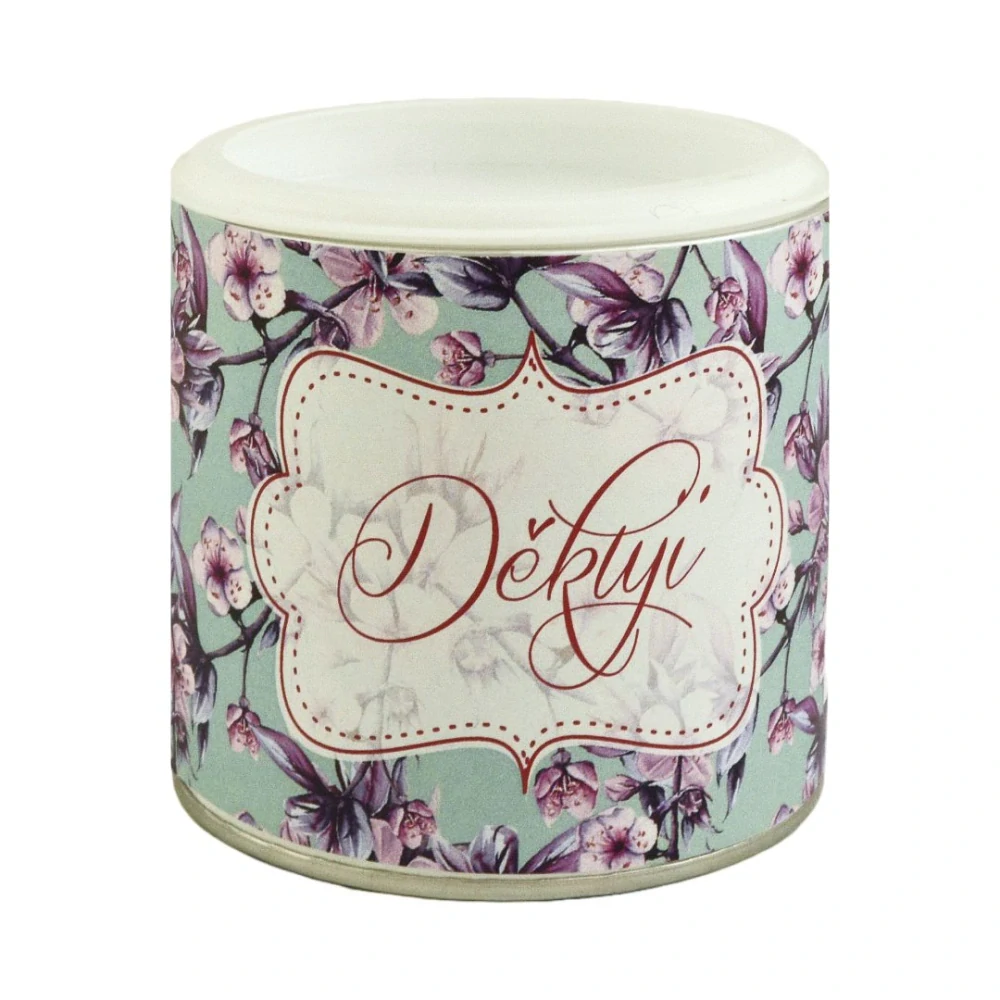 Mandle v mléčné čokoládě se skořicí v elegantní dárkové dóze s jemným motivem třešňových květů na pastelově modrém pozadí je krásným způsobem poděkování.