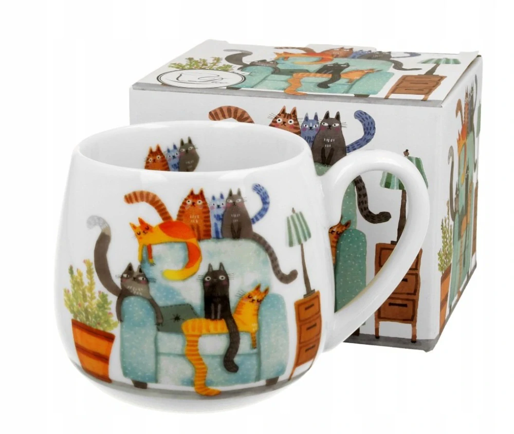 Klasický hrnek s motivem pestrobarevných domácích koček odpočívajících na velkém křesle. Ideální pro přípravu vašeho oblíbeného čaje.