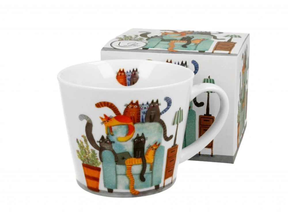 Velký hrnek s motivem pestrobarevných domácích koček odpočívajících na velkém křesle. Ideální pro přípravu vašeho oblíbeného čaje.