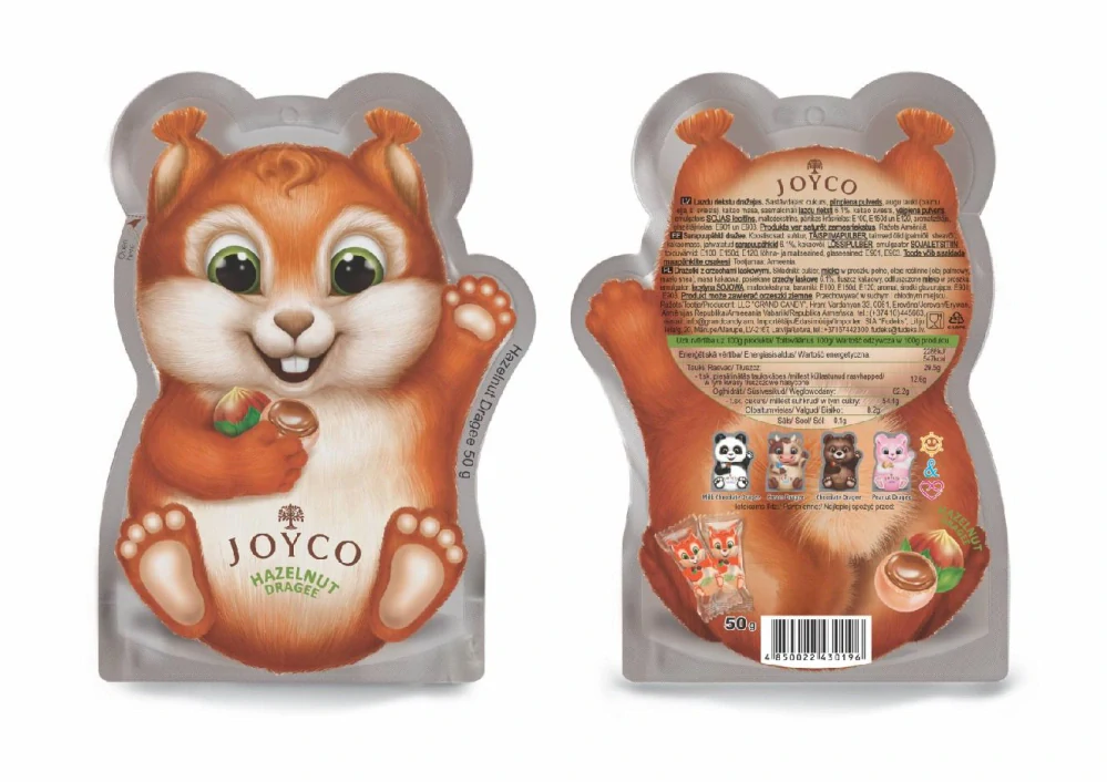 Malé kakaové bonbónky pro děti, jednotlivě balené, ve tvaru roztomilých veverek. Hmotnost 50 g.